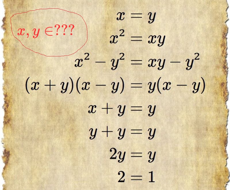 The symbols 𝒙 and 𝒚 have no meaning until we specify the universe of rules they belong to. For instance, are we working within a ring, an integral domain, or a field? And beyond that, what is the characteristic of the ring or field? Is the structure commutative?